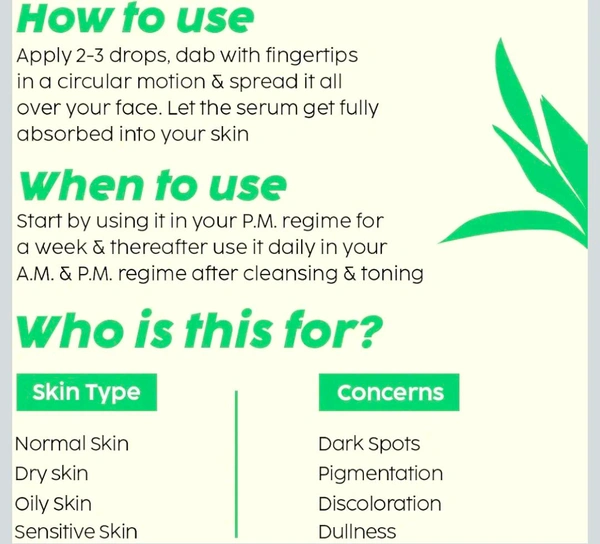 How To Use: Apply 2 to 3 drops of serum to clean, dry skin, and dab with fingertips in a circular motion & spread it all over your face. Use it in your P.M. regime for the first week and then use it in your A.M. & P.M. regime after cleansing & toning