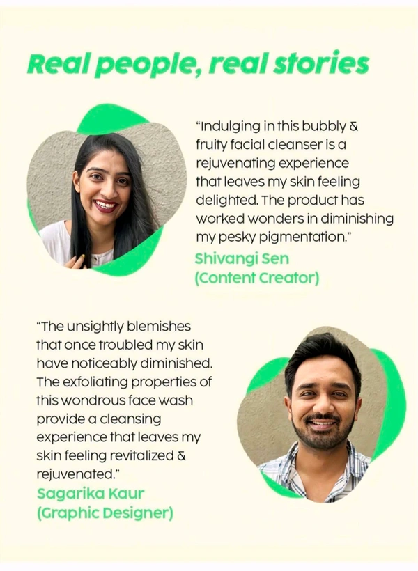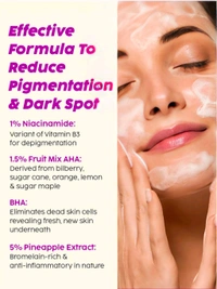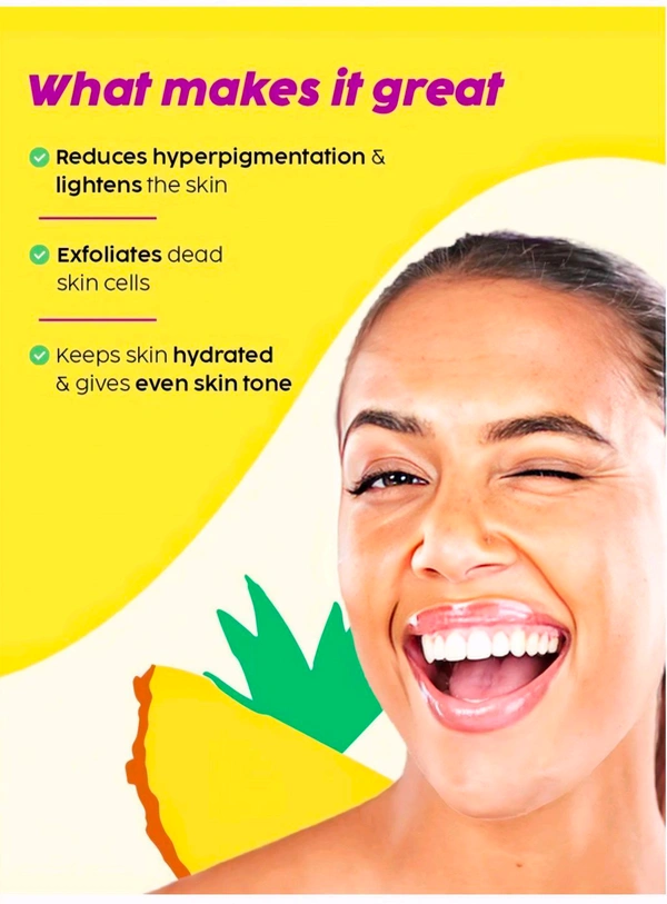 This fruity Pineapple facewash helps to fade pigmentation and offer glowing radiance! The fruit+active formula in this face care face wash assists in treating pigmentation-associated skin discoloration, dark spots and expertly exfoliates skin to eliminate dead cells, dirt, and debris from your skin. This niacinamide face wash lightens acne marks to reveal even-toned skin. Our Pineapple depigmentation skin brightening good vibes face wash for women and men aims to deeply cleanse your skin with its bromelain-enriched formula. High-performing bio-actives like Niacinamide help to reduce pigmentation and dark spots to fade dullness and discoloration from your complexion. Fruit Mix AHAs assist in effectively eliminating dead skin cells to unveil new skin underneath. Pineapple+actives in this fruity cleansing facewash aim to control excess sebum production to lessen inflammation, acne scarring, and enlarged pores. This depigmentation facewash is amazing skin care for men and women who want to have a brighter and even-toned complexion.