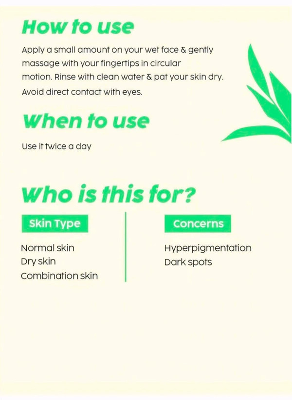 How To Use: Apply a small amount on your wet face & gently massage with your fingertips in a circular motion. Rinse off with water & pat dry. Avoid direct contact with eyes. Apply it in both your A.M. & P.M. regimen.